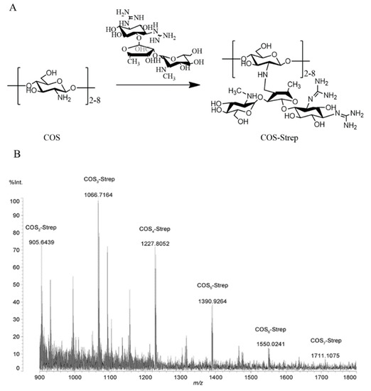 Reaction scheme of the chitosan oligosaccharides-streptomycin (COS-Strep) conjugate synthesis and characterization of synthesized products. Schematic diagram represented the reaction to synthesize of COS-Strep conjugates (A). The mass spectrum of COS-Strep conjugates by matrix-assisted laser desorption/ionization time of flight (MALDI-TOF) mass spectrometry (B).