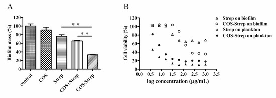 In order to evaluate the anti-biofilm activity of COS-Strep conjugates, different treatments were conducted as indicated below. Blank LB broth, LB broth with COS, and LB broth with Strep were used as controls. Moreover, LB broth with the mixture of COS and Strep was also included as a control to determine the necessity of the conjugation. After biofilm formation, the 96-well plate was washed three times with phosphate buffer saline (PBS, pH 7.2) to remove the unattached cells. COS-conjugate and different controls were added into the washed biofilms separately, and the 96-well plates were then incubated at 28 °C for 24 h. Biofilms were washed three times with PBS prior to the analysis. The biofilm mass was determined by the crystal violet assay [17]. The sample was measured for absorbance at 590 nm with a TECAN Infinite M200 PRO multifunction microplate reader (TECAN, Grodig, Austria). To determine the cell viability of the biofilm, MTT [3-(4,5-dimethylthiazol-2-yl)-2,5-diphenyltetrazolium] assay was performed as previously described [18]. Briefly, 100 µL of 500 μg/mL MTT was added into each well and the plate was incubated for 3 h. MTT was then removed and the formed formazan was dissolved in 100 μL dimethyl sulfoxide (DMSO). Optical density (OD) of samples were measured at 490 nm using a TECAN Infinite M200 PRO multifunction microplate reader (TECAN, Grodig, Austria). The IC50 of anti-biofilm agents was analyzed using the standard broth microdilution method in accordance with the Clinical and Laboratory Standards Institute (CLSI) guidelines. All tests were performed in six replicates for each treatment. Each assay was performed with three biological repeats.