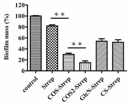 The anti-biofilm activity of COS-Strep with different polymerization degrees. Mature P. aeruginosa biofilms were exposed to 250 μg/mL COS-Strep, COS2-Strep, GlcN-Strep and chitosan-streptomycin conjugate (CS-Strep) for 24 h. The residual biofilm mass relative to the control was assessed by the crystal violet staining assay. Data are represented as means ± SD (n = 6). * p < 0.05; ** p < 0.01.