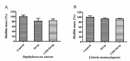 To investigate the anti-biofilm activity of COS-Strep on other bacteria, we assessed the activity of COS-Strep on mature biofilms of S. aureus and L. monocytogenes, which are Gram-positive opportunistic human pathogens. COS-Strep or Strep alone did not show inhibition effects against biofilms of tested strains at 250 μg/mL (Figure 4).
