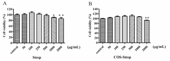 The cell toxicity of streptomycin (A) and COS-Strep (B) on HUVEC cells. Data are represented as means ± SD (n = 8). * p < 0.05 or ** p < 0.01, compared to the control group.