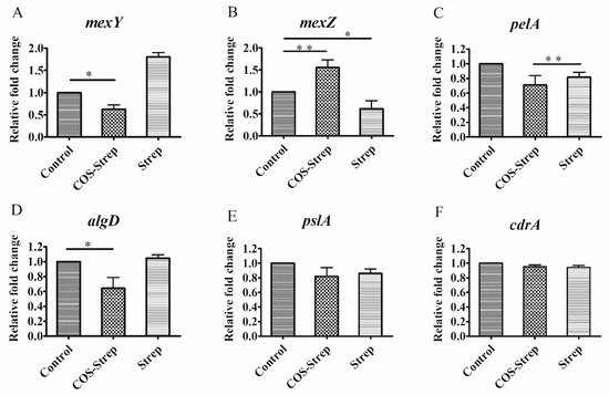 Differences in the expression levels of biofilm-related genes of P. aeruginosa. mexY (A), mexZ (B), pelA (C), algD (D), pslA (E), and cdrA (F) in P. aeruginosa following COS-Strep or streptomycin treatment. Data are represented as means ± SD (n = 3). * p < 0.05; ** p < 0.01.