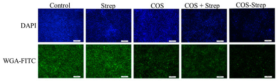 In order to investigate the effect of COS-Strep on biofilm exopolysaccharides, we stained the biofilm with FITC labeled wheat germ agglutinin (WGA) lectin which bound to exopolysaccharide, and DAPI. We observed the reduction of signals with WGA-FITC and DAPI staining after COS-Strep treatment, suggesting its influence on both biofilm cell viability and exopolysaccharide (Figure 7).