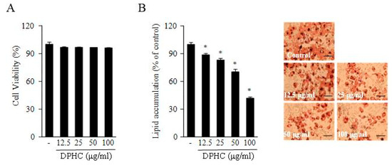 Cytotoxicity of DPHC against 3T3-L1 cells was assessed via a colorimetric MTT assay. 3T3-L1 preadipocytes plated on 24-well plates were treated with DPHC at 37 °C for 48 h. MTT stock solution (100 μL; 2 mg/mL in PBS) was then added to each well to a total reaction volume of 600 μL. After 4 h of incubation, the plates were centrifuged (800× g, 5 min) and the supernatant was aspirated. The formazan crystals in each well were dissolved in 300 μL of DMSO, and the absorbance was measured with an ELISA plate reader at 540 nm.