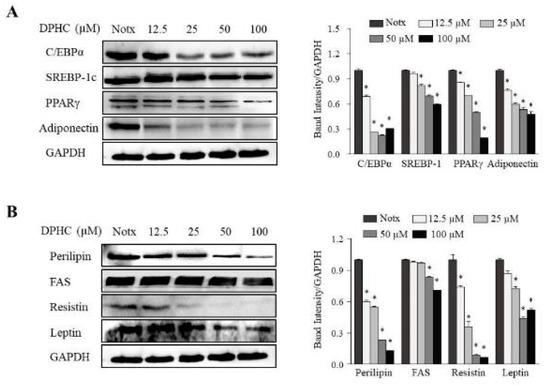 The effect of DPHC treatment on adipogenic-specific protein levels in 3T3-L1 adipocytes. The 3T3-L1 preadipocytes were incubated in a differentiation medium with or without the indicated concentrations of DPHC for eight days (from day 0 to day 8). The expression of sterol regulatory element-binding protein 1c (SREBP-1c), peroxisome proliferator-activated receptor-γ (PPARγ), CCAAT/enhancer-binding protein α (C/EBPα), and adiponectin were assessed by Western blotting (A). The expression of perilipin, fatty acid synthase (FAS), fatty acid binding protein (FABP4), and leptin were assessed by Western blotting (B). Immunoblot figures are representative of three independent experiments, and each value is expressed as the mean ± SE of three determinations. Significant differences from the control group were identified at * p < 0.05.