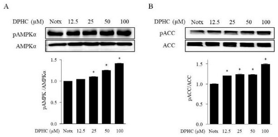 The 5’ adenosine monophosphate-activated protein kinase (AMPK) is a major regulator of whole-body energy homeostasis, which gets activated by lower intracellular ATP levels. Recent reports suggest that AMPK plays an important role in the metabolism of energy, glucose, and ATP production [20]. We investigated the effect of DPHC on the phosphorylation of AMPK and acetyl-CoA carboxylase (ACC) in adipocytes. As shown in Figure 3, DPHC treatment significantly increased both AMPK and ACC phosphorylation in 3T3-L1 adipocytes. These results indicate that DPHC could inhibit fat accumulation by activating AMPK and ACC in 3T3-L1 cells.