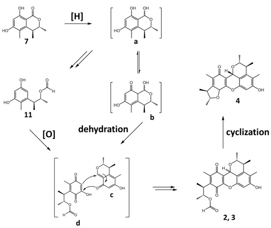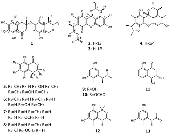 - Krohn, K.; Florke, U.; Rao, M.S.; Steingrover, K.; Aust, H.J.; Draeger, S.; Schulz, B. Metabolites from fungi 15. New Isocoumarins from an Endophytic Fungus Isolated from the Canadian Thistle Cirsium arvense. Nat. Prod. Lett. 2001, 15, 353–361. [Google Scholar] [CrossRef]