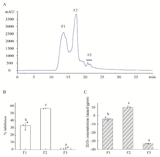 The hydrophobic extract of F2, which showed the largest percentage inhibition, was loaded onto a RP-HPLC system equipped with a C18 column (4.6 × 250 mm, 5 μm, Sunfire™, Waters, MA, USA) for further separation. Solvent A, 0.1% (v/v) trifluoroacetic acid (TFA) in water, and solvent B, 100% acetonitrile with 0.1% (v/v) TFA, were used for elution. A gradient elution was carried out as follows: 0–25 min, 5–45% solvent B; 25–30 min, 45–85% solvent B; 30–40 min, 85–95% solvent B; 40–50 min, 95–5% solvent B; 50–60 min, 95–5% solvent B, at a constant flow rate of 1.0 mL/min, and measured at 280 nm. Major separated peaks of F2 were collected, then freeze-dried. The percentage inhibitions of major peaks in F2 against E. coli cells, as well as the H2O2 self-production capacity were measured and compared.