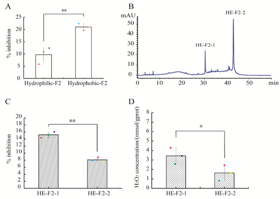 Purification of active fraction F2 using reverse phase high performance liquid chromatography (RP-HPLC) and the activities of sub-fractions assay: (A) percentage inhibition of hydrophilic and hydrophobic extracts of F2; (B) chromatogram of active fraction F2 by RP-HPLC, measured at 280 nm; (C) percentage inhibition of F2-1 and F2-2; and (D) H2O2 production capacity of F2-1 and F2-2. Spots in (A,C,D) represent the raw data. The results are expressed as the mean ± standard deviation (n = 3). The symbol of “**” and “*” in (A,C,D) represent significant differences of p < 0.01 and p < 0.05, respectively.