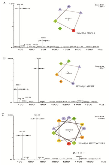 ESI-MS and helical wheel projection of synthetic peptides: (A) HGM-Hp1, FEDQLR; (B) HGM-Hp2, ALERTF; and (C) HGM-Hp3, RHPEYAVSVLLR. The helical wheel projection of HGM-Hp1, HGM-Hp2, and HGM-Hp3 (insert diagrams in Figures (A–C)) were performed using the online website tool (http://rzlab.ucr.edu/scripts/wheel/wheel.cgi). In helical wheel projection, circles and diamonds represent hydrophilic and hydrophobic residues, respectively. The green color, whose intensity decreases proportionally to the hydrophobicity, represents the most hydrophobic residue. Non-hydrophobic portions are encoded in yellow. The red color is used to encode hydrophilic residues, whose intensity represents the extent of hydrophilicity. The charged residues are encoded in light blue. Negatively charged and positively charged residues are displayed as triangles and pentagons, respectively. The hydrophobic moment is denoted in the center.