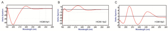 CD spectra of synthetic peptides in membrane-mimicking solution (1.6 mmol/L sodium dodecyl sulfate (SDS), dissolved in 10 mmol/L PBS, pH 7.4): (A) HGM-Hp1; (B) HGM-Hp2; and (C) HGM-Hp3. The peptide concentration was 0.5 mg/mL.