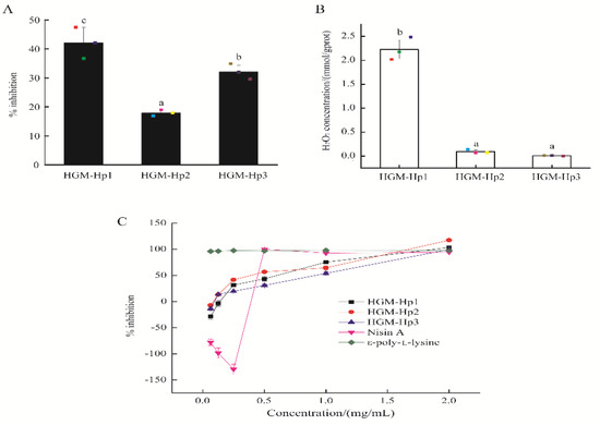 At the actual peptide concentration of 0.25 mg/mL, HGM-Hp1 demonstrated the highest percentage inhibition (42.10 ± 5.36%), in contrast to HGM-Hp2 (17.93 ± 1.03%) and HGM-Hp3 (32.14 ± 2.19%) (p < 0.05) (Figure 5A). In addition, the peptide HGM-Hp1 exhibited the highest H2O2 self-production capacity among the three synthetic peptides (p < 0.05) (Figure 5B). All synthetic peptides showed concentration-dependent inhibition of the growth of E. coli cells, as shown in Figure 5C. In addition, no growth of E. coli cells was observed after treatment with the synthetic peptides at the actual peptide concentration of 2 mg/mL. Therefore, the MIC was 2 mg/mL for peptides HGM-Hp1, HGM-Hp2, and HGM-Hp3 against the growth of E. coli. By comparison, nisin A, an AMP from Lactococcus lactis, had negative inhibition effects on E. coli cells at the concentration below 0.5 mg/mL. The antibacterial effect of nisin A reached a plateau (100% inhibition) when its concentration was increased to 0.5 mg/mL. Similar to our results, Tong et al. [1] reported the MIC of nisin against Enterococcus faecalis was 1 g/L (actual concentration of 0.5 mg/mL). Natural ε-poly-lysine has a broad antimicrobial activity against Gram-negative and Gram-positive bacteria [35]. In this study, the percentage inhibition on E. coli was 95.99% after treatment with 62.5 μg/mL of ε-poly-lysine. This result was in agreement with the MIC of ε-poly-lysine solution, which was less than 100 μg/mL against E. coli [36]. ε-poly-lysine consists of 25–30 positively charged L-lysine residues, which are responsible for its strong antibacterial activity [35].