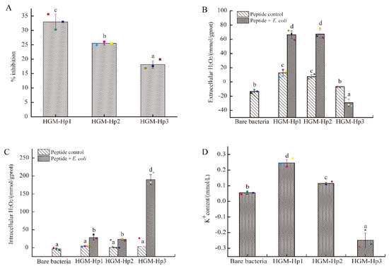 Likewise, the intracellular H2O2 concentration in E. coli cells after incubation with HGM-Hp1 or HGM-Hp2 were significantly higher than those in the bare bacteria or their peptide controls (p < 0.05) (Figure 6C). In contrast, the increase of extracellular H2O2 production was not observed in the logarithmic phase of E. coli cells after treatment of HGM-Hp3 (Figure 6B). Nevertheless, the highest intracellular H2O2 concentration in E. coli cells was induced by HGM-Hp3 addition (189.74 mmol/gprot), which was dramatically increased than those in HGM-Hp1 (28.16 mmol/gprot) or HGM-Hp2 (23.35 mmol/gprot) treatment (p < 0.05) (Figure 6C). The results in Figure 6 suggest that peptides HGM-Hp1, HGM-Hp2, and HGM-Hp3 induced intracellular H2O2 production in logarithmic phase of E. coli cells. This result is similar to our previous study of HAHp(9.0)-G MRPs, which induced H2O2 production in E. coli cells after 3 h of incubation at 37 °C [19]. In a recent study, Bucekova et al. (2018) [41] reported the antibacterial activity of honey samples incubated at 45 °C was enhanced by 25% when compared to untreated honeys, and significantly increased H2O2 accumulation and glucose oxidase activity were detected as well in the honey samples exposed to 45 °C. This means the H2O2 formation in samples or treated cells could play a crucial role for the antibacterial activity of mild thermal products or MRPs.