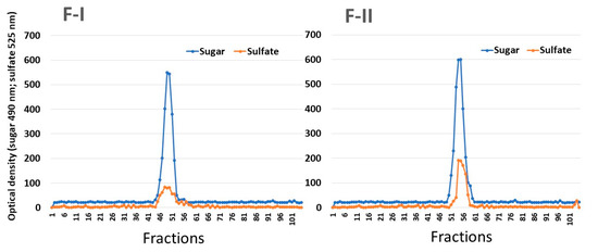Gel permeation chromatography of SPs from U. flabellum. F-I and F-II were introduced into a Sephadex G-100 column (140 × 1 cm). The column was eluted with 0.2 M acetic acid, and 1 mL fractions were collected, which were then analyzed for the presence of sugars by the Dubois method and metachromasia, as described in Section 3.