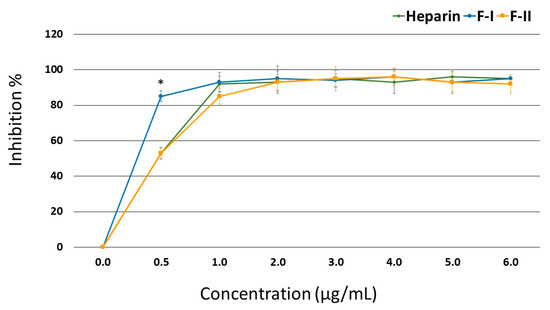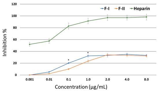 Figure 3 shows that in the presence of AT, F-II inhibited the thrombin activity just as efficiently as heparin; starting from 1.0 μg/mL, this effect reached approximately 93% inhibition. In the case of F-I, a concentration of 0.5 μg/mL showed a greater inhibitory effect than heparin (85.3% vs. 53.4% inhibition, respectively), but its inhibitory effect became similar to that of heparin from 1.0 μg/mL onwards.