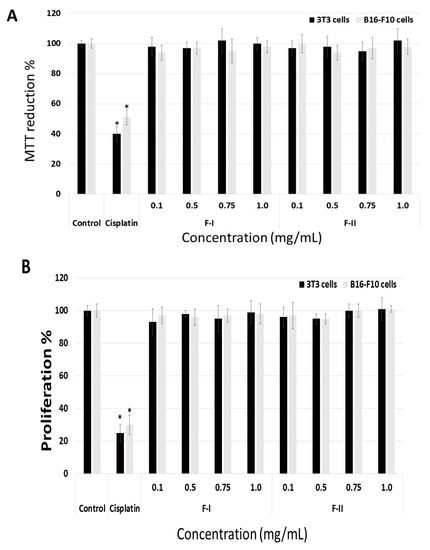 Effect of different concentrations (mg/mL) of F-I or F-II on the ability of fibroblast (3T3) cells to reduce MTT (3-(4,5-dimethylthiazol-2-yl)-2,5-diphenyltetrazolium bromide)) (A) and incorporate BrdU (5-Bromo-2-Deoxyuridine) (B) The cells were cultured with different concentrations of F-I or F-II (from 0.1 to 1.0 mg/mL) for 24 h, and subsequently subjected to MTT test or BrdU test. Control (negative control) consisted of only the culture medium with fetal bovine serum. Positive control comprised culture medium with fetal bovine serum and cisplatin (0.005 µg/mL). * p < 0.001 vs. control.