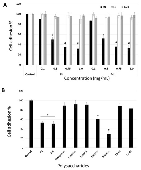 (A) Anti-adhesive effect of F-I and F-II on B16-F10 attachment to fibronectin. (B) Effects of different sulfated polysaccharides (0.5 mg/mL) on B16-F10 adhesion to fibronectin. Fuc B and Fuc A—fucan A and B from brown seaweed Spatoglossum schroederi, respectively; Hep—heparin; CS-6S—chondroitin-6-sulfate; CS-4S—chondroitin-4-sulfate; fucoidan—SP obtained from brown seaweed Fucus vesiculosus. * p < 0.05 vs. control. # p < 0.001 vs. control.