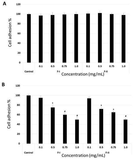 Tumor cells tend to migrate to the basement membranes, where they are known to adhere strongly. In fact, the invasion of tumor cells through basement membranes and adhesion to extracellular matrix proteins (laminin, fibronectin, vitronectin, etc.) are the crucial steps in metastasis. Therefore, drugs that inhibit cell adhesion should prevent the formation of metastasis [31]. Thus, we studied the ability of B16-F10 cells to interact with exogenous proteins, e.g., fibronectin (FN), laminin (LN), and type I collagen (Col I) in the presence of F-I or F-II (from 0.1 to 1.0 mg/mL), in a cell adhesion assay. The data are shown in Figure 5.