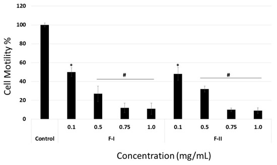 When laminin or collagen I was the substrate, F-I and F-II did not affect cell migration at any of the tested concentrations (data not shown). In contrast, when fibronectin was the substrate, even the lowest tested samples concentration (0.1 mg/mL) inhibited cell migration by about 50% (Figure 7). In addition, the anti-migratory effect of F-I and F-II was dose-dependent, like the adhesion assay.