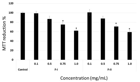 Anti-proliferative effect of F-I and F-II (from 0.1 to 1.0 mg/mL) on B16-F10 cells coated onto fibronectin. Data are presented as means ± standard deviation. * p < 0.05 vs. control.