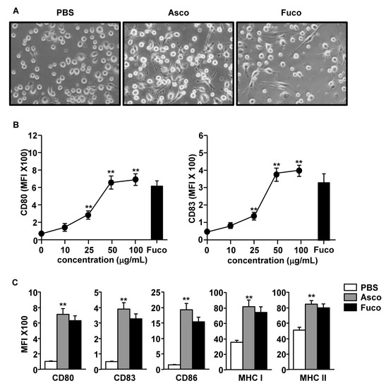 Activation of human monocyte-derived dendritic cells (MDDCs) by ascophyllan. CD14+ monocytes were differentiated to MDDCs by culturing with 50 ng/mL of granulocyte-macrophage colony-stimulating factor (GM-CSF) and 50 ng/mL of interleukin-4 (IL-4) for 6 days. (A) Changes in morphology are shown 24 h after treatment with PBS, ascophyllan (asco) or fucoidan (fuco). (B) Expression levels of CD80 (left panel) and CD83 (right panel) in MDDCs 24 h after treatment with different doses of ascophyllan. (C) Expression levels of co-stimulatory molecules were measured 24 h after treatment of PBS, ascophyllan (50 μg/mL) and fucoidan (50 μg/mL). Mean fluorescence intensity (MFI) levels of CD80, CD83, CD86, MHC class I and MHC class II in MDDCs are shown. Data are representative of or the average of analyses of 6 independent samples. ** p < 0.01.