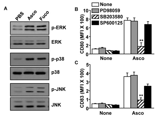 Phosphorylation of mitogen-activated protein kinase (MAPK) signaling pathway in MDDCs by ascophyllan. (A) Phosphorylation of ERK, p38 and JNK was analyzed in MDDCs by western blotting after 1 h of ascophyllan (50 μg/mL) or fucoidan (50 μg/mL) treatment. (B and C) MDDCs were pre-treated with PD98059 (ERK inhibitor; 10 μM), SB203580 (p38 inhibitor; 2μM) or SP600125 (JNK inhibitor; 10 μM) for 1 h and then stimulated with ascophyllan for 24 h. (B) MFI levels of CD80 and (C) CD86 are shown. All data are representative of or the average of analyses of 6 independent samples. ** p < 0.01.