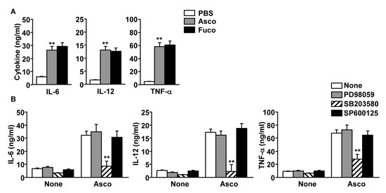 Production of pro-inflammatory cytokines from MDDCs by ascophyllan. MDDCs were treated with PBS, 50 μg/mL ascophyllan (asco) or 50 μg/mL fucoidan (fuco) for 24 h and culture medium was harvested. (A) The concentration of interleukin-6 (IL-6), IL-12 and TNF-α in a culture medium. (B) MDDCs were pre-treated with inhibitors as shown in Figure 2B,C, then cultured with PBS, ascophyllan or fucoidan for 24 h. IL-6, IL-12 and TNF-α levels were measured using ELISA. All data are the average of analyses of 6 independent samples. ** p < 0.01.