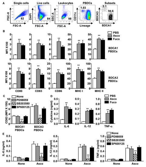 Activation of peripheral blood dendritic cell (PBDC) subsets following treatment with ascophyllan. Peripheral blood mononuclear cells (PBMCs) were cultured with PBS, 50 μg/mL ascophyllan (asco) or 50 μg/mL fucoidan (fuco) for 24 h. (A) BDCA1+ and BDCA3+ PBDCs were defined by flow cytometry from CD11c+lineage− live leukocytes of PBMCs. (B) Co-stimulatory molecules and MHC class I and II expression in BDCA1+ and BDCA3+ PBDCs are shown. (C) PD98059 (ERK inhibitor; 10 μM), SB203580 (p38 inhibitor; 2 μM) or SP600125 (JNK inhibitor; 10 μM) were pre-treated in PBDCs for 1 h and the PBDCs were stimulated with 50 μg/mL ascophyllan for 24 h. Expression levels of CD83 were measured in BDCA1+ and BDCA3+ PBDCs. (D) Concentration of IL-6, IL-12 and TNF-α in a culture medium of PBMCs. (E) Concentrations of IL-6, IL-12, TNF-α in culture medium from Figure 4C were measured using ELISA. All data are representative of or the average of analyses of 6 independent samples. ** p < 0.01.