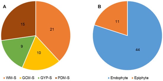 The number of identified fungal isolates from Fucus vesiculosus. (A) The number of fungal strains isolated from single solid medium (S). WM-S = modified Wickerham medium, PDM-S: Potato Dextrose medium, GCM-S; Glucose Casein medium, GYP-S; and Glucose Yeast Peptone medium. (B) The origin of fungi from F. vesiculosus microhabitats.