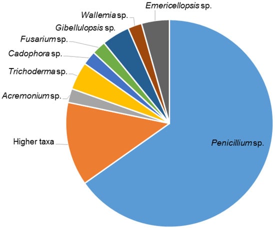 Taxonomical diversity of 55 fungal genera isolated from F. vesiculosus (excluding sediment and seawater). Strains that were not identified to genus level were indicated with ‘Higher taxa’.