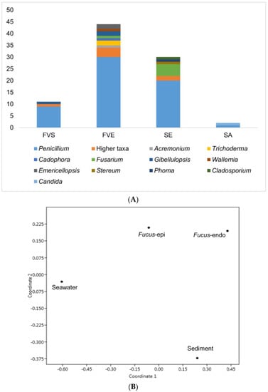 In addition, we identified four genera Acremonium, Gibellulopsis, Trichoderma, and Emericellopsis (Figure 3A) from the Baltic F. vesiculosus. Since they are absent in the sediment or seawater samples, they can be regarded as specific to the seaweed. These genera have also been isolated from the North Sea F. serratus samples [1]. A Cadophora sp. has previously been reported from the green alga Enteromorpha sp. [30], but not from any brown algae before. In the present study, we identified an endophytic Wallemia sp. This fungal genus is generally considered as xerophilic (adapted to dry conditions or high salinity) [31], and has previously been obtained from air, soil, dried food, and salt. To our knowledge, this is the first report of this genus being associated with a marine alga. The seawater control sample yielded a Candida sp., which is commonly found in seawater [32]. Finally, we isolated three fungal strains, Cladosporium sp., Phoma sp. and Stereum sp., that were exclusive to sediment surrounding F. vesiculosus (Figure 3A). Cladosporium and Phoma species are very common molds in sediment samples [33]. Stereum species belong to mycobiota of trees and known for wood-destroying and carbon recycling properties of arid forest ecosystems [34], but has never been isolated from a marine sediment before.