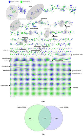 The effect of culture regime (liquid versus solid) was ascertained by comparing liquid and solid culture groups from the MN (Figure 4A). The Euler diagram derived from MN (Figure 4B) pointed out to clear differences in the chemical profile of the liquid and solid culture extracts. In total 4782 nodes (ions) were identified. The extracts deriving from the solid cultures (in total 3235 nodes) and the liquid cultures (in total 2699 nodes) had only 1152 nodes in common, indicating <24% similarity of total 4782 nodes (Figure 4B). Approximately, 32% of the total nodes (i.e., 1547 specific nodes) were expressed exclusively in the liquid culture extracts, while 2083 nodes (≈43%) in the solid culture extracts. The comparison of the liquid and solid culture-derived fungal extracts clearly points out a differential chemistry. The observed metabolic differences suggest activation of different BGCs under different culture regimes.