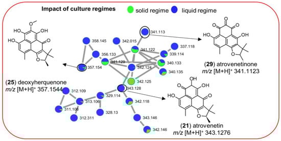 Annotation efforts of the chemical inventory of the extracts revealed only a few metabolites to be common in both liquid and solid cultures, e.g., the aminolipid family (7–11) and aromatic polyketide deoxyherquenone (25) (Figure 4A, Table S2) in both Cza-L and Cza-S media. Interestingly, several metabolites were mapped to only one culture regime. For example, the cyclic depsipeptide enniatin B1 (34) (Figure 4A and Figure S6) was detected only in liquid culture conditions. Importantly, their production was dependent on the culture regime, but was not much affected by the growth media. In addition to induction of different chemical families in individual culture regimes, we also observed production of compounds in both culture regimes. A good example is the aromatic polyketide family (21, 25, 29) that was detected in multiple extracts of strain 68 (Penicillium sp., Table S2). Deoxyherquenone (25, m/z [M + H]+ 357.1544) was present in all liquid and solid culture extracts, whereas its analogues atrovenetinone (29, m/z [M + H]+ 341.1123) and atrovenetin (21, m/z [M + H]+ 343.1276) were exclusive to liquid culture regimes. As shown in Figure 5, with 22 nodes observed in liquid culture-based extracts and 13 nodes in solid extracts of the strain 68, liquid culture conditions clearly led to a higher chemical diversity for this molecular family, clearly demonstrating the impact of the culture regime on variable chemical composition of the same strain.