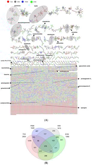 (A) Global MN of crude extracts of 10 fungal strains originating from 4 media (Cza, PDM, SYM, WM). See Table S2 for annotated molecules. Red: Nodes detected in Cza extracts. Blue: Nodes detected in PDM extracts. Green: Nodes detected in SYM extracts. Grey nodes: Nodes detected WM medium extracts. Grey loop: Nodes annotated as putatively known chemical clusters. (B) Venn diagram comparing the number of ions detected in different media. Cza (pink), PDM (blue), WM (grey), and SYM (green). Numbers of shared ions and specific ions only produced in one media-based extract were shown in differently shaded areas, while the total number of ions detected in each medium extract is shown underneath the medium name.