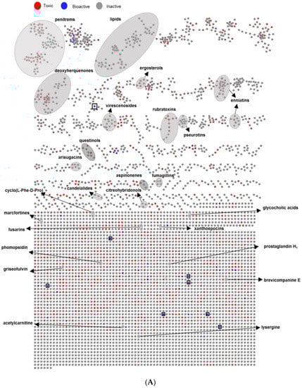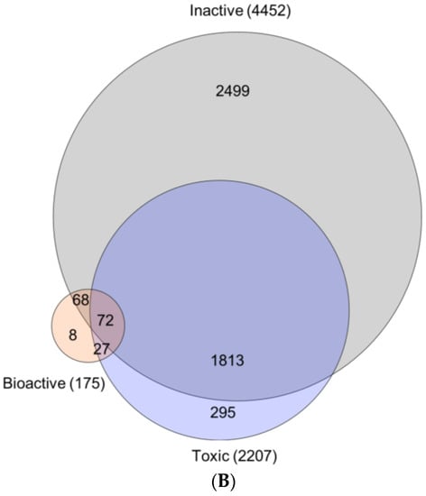 As shown in the Euler diagram (Figure 7B), altogether 4452 nodes were detected in the inactive extracts, 2207 nodes in the toxic extracts, while the two bioactive extracts collectively comprised 175 nodes. Respectively, 2499 and 295 nodes were exclusive to the inactive and the toxic extracts. The bioactive extracts had only eight nodes that were specifically produced in them, but shared 27 nodes with the toxic and 68 with inactive extracts. Seventy-two nodes were common to all extracts.