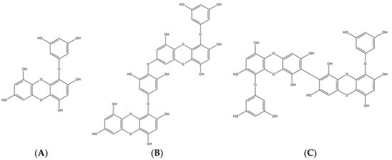 The chemical structures of (A) eckol, (B) dieckol, and (C) 8,8′-bieckol.