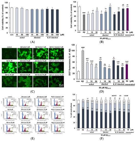 Neuroprotective effects of eckol, dieckol and 8,8′-bieckol in Aβ25-35-stimulated PC12 cells. (A) The cytotoxic effects in PC12 cells treated with compounds of phlorotannin alone. (B) Prevention of Aβ25-35-induced cell death by eckol, dieckol and 8,8′-bieckol. PC12 cells pretreated with compounds of phlorotannin for 1 h followed by exposure to 50 µM Aβ25-35 for 24 h. Cell viability was measured by MTT assay. (C,D) The fluorescence images of ROS generation. (E,F) Cell cycle analysis assessed by flow cytometry. The cell suspensions were fixed by ethanol for 3 h, and then the supernatants were removed and 200 µL Muse™ Cell Cycle Reagents were added. ### p < 0.001 indicates significant differences from the control. *** p < 0.001, ** p < 0.01 and * p < 0.05 indicates significant differences from the Aβ25-35 treatment alone. Different alphabet letters indicate a significant difference between groups at p < 0.05.