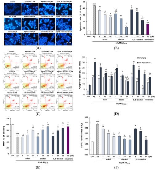 Protective effects of eckol, dieckol and 8,8′-bieckol on Aβ25-35-indued apoptosis in PC12 cells. (A) Morphological apoptosis determined by fluorescence microscopy (400×). (B) The percentage of apoptotic cells of the total number of cells. (C,D) Early and late apoptosis detected by flow cytometry using Annexin V/7-AAD staining. The lower left area means normal cells (annexin V−/7-AAD−), lower right area means early apoptotic cells (annexin V+/7-AAD−), upper right area means late apopotic and dead cells (annexin V+/7-AAD+) and upper left area means dead cells (annexin V−/7-AAD+). (E) Analysis of MMP examined by rhodamine 123. (F) The intracellular Ca2+ levels analyzed using fluo-3AM. ### p < 0.001 and ## p < 0.01 indicate significant differences from the control. *** p < 0.001, ** p < 0.01 and * p < 0.05 indicate significant differences from the Aβ25-35 treatment alone. Different alphabet letters indicate a significant difference between groups at p < 0.05.