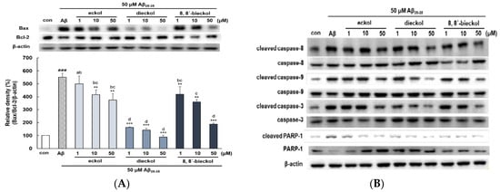 Pro-apoptotic Bax and anti-apoptotic Bcl-2 proteins are members of the Bcl-2 family and contribute to the initiation of apoptotic pathway in mitochondria [], suggesting that the Bax/Bcl-2 ratio could be determined as one of the apoptotic biomarkers. Aβ25-35 increased the Bax/Bcl-2 ratio at the protein levels in PC12 cells. The highest decrease of the Bax/Bcl-2 ratio was carried out by dieckol at 50 µM (88.92% ± 13.5%) when compared with Aβ25-35 (551% ± 28.9%) and the control (Figure 4A).