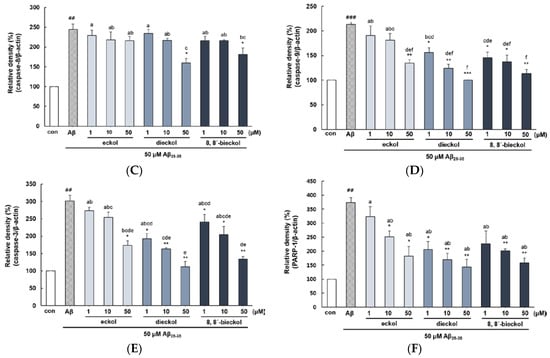 Inhibitory effects of eckol, dieckol and 8,8′-bieckol against apoptotic biomarkers in Aβ25-35-treated PC12 cells. (A) The ratio of Bax/Bcl-2. (B) Representative western blot bands of caspases and PARP-1. The expression of (C) caspase-8, (D) caspase-9, (E) caspase-3, (F) PARP-1. ### p < 0.001 and ## p < 0.01 indicate significant differences from the control. *** p < 0.001, ** p < 0.01 and * p < 0.05 indicate significant differences from the Aβ25-35 treatment alone. Different alphabet letters indicate a significant difference between groups at p < 0.05.