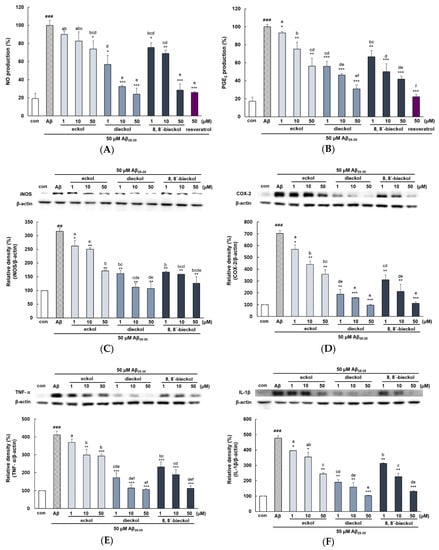 Treatment of Aβ25-35 exhibited a marked induction of NO and PGE2 production (Approximately 5 fold) compared with the control group (Figure 5A,B). Particularly, when cells were preincubated with 10 and 50 µM of dieckol or 50 µM of 8,8′-bieckol, NO expression was obviously suppressed to a similar value as that of the positive control. However, eckol had a significant effect only at 50 µM compared to Aβ treatment group. Treatment with phlorotannins resulted in a significant and dose-dependent decrease in Aβ25-35-induced PGE2 production. PGE2 level in cell treated with dieckol and 8,8′-bieckol were significantly lower than those of the eckol treated group (p < 0.05). Dieckol had the greatest ability to attenuate PGE2 levels, which was similar level with resveratrol. In agreement with our result, Yang et al reported that administration of dieckol (10, 50, and 100 mg/kg) suppressed serum levels of NO and PGE2 in LPS-induced septic shock mice [].