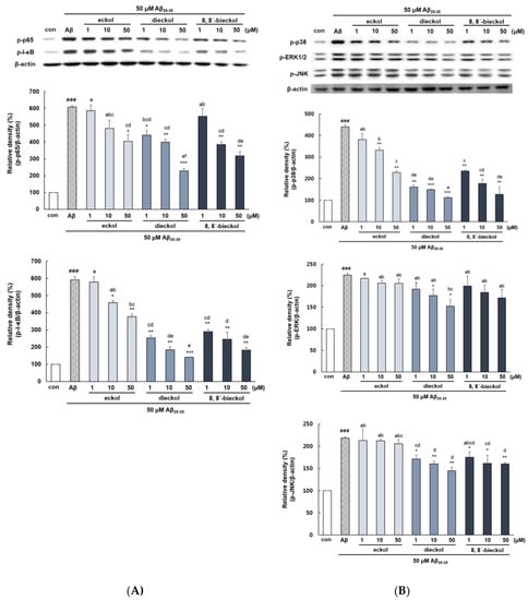 Effect of eckol, dieckol and 8,8′-bieckol on NF-κB and MAPKs activation in Aβ25-35-treated PC12 cells. (A) The results of western blot analysis of p-p65 and p-IκB. The PC12 cells were incubated with samples for 1 h followed by stimulation with Aβ25-35 for 4 h. The proteins of cell lysates were measured by BCA assay. (B) The results of western blot analysis of p-p38, p-ERK1/2 and p-JNK. The PC12 cells were treated with samples for 1 h, and then stimulated with Aβ25-35 for 1 h. ### p < 0.001 and ## p < 0.01 indicate significant differences from the control. *** p < 0.001, ** p < 0.01 and * p < 0.05 indicate significant differences from the Aβ25-35 treatment alone. Different alphabet letters indicate a significant difference between groups at p < 0.05.