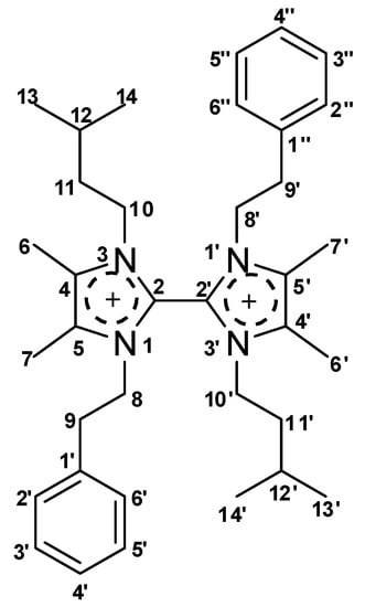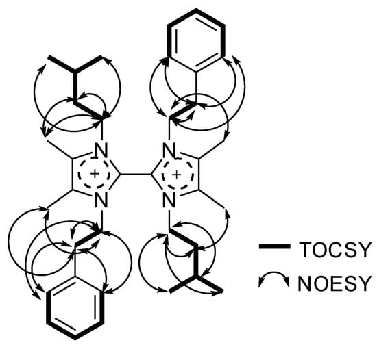 Compound 1 was obtained at tR of 37.0 min on semi-preparative reverse phase HPLC. It is a colorless and odorless oil when completely free of solvent. The HRESI-LC-MS of compound 1 gave an m/z of 271.2162, corresponding to a molecular formula of C18H27N2 (Δ = 0.001 and 7 degrees of unsaturation). It appears that compound 1 easily fragments in the mass spectrometer to yield two fragments with the same m/z of 271.2162 (Supplementary Figures S2–S4). Therefore, the m/z of 1 was calculated as 540.4186, which corresponds to the molecular formula of C36H52N4 with 14 degrees of unsaturation. Analysis of the 1H, 13C, and multiplicity edited gHSQCAD spectra of 1, suggested the presence of 8 quaternary, 12 methine, 8 methylene, and 8 methyl carbons. The 1H-NMR chemical shifts δH 7.10 (4H, m, H-2′, H-2″, H-6′, H-6″), 7.31 (4H, m, H-3′, H-3″, H-5′, H-5″), and 7.29 (2H, m, H-4′, H-4″) provided direct evidence for the presence of two mono-substituted benzene rings. Mono-substituted benzene rings have a well-known reputation of producing weakly resolved multiplicity patterns due to the identical coupling constants which exist in such systems. Detailed analysis of the gCOSY spectrum showed correlations H-2′/H-3′, H-2″/H-3″, H-5′/H-6′, and H-5″/H-6″, which were further supported by similar 2D-TOCSY correlations, including H-2′/H-4′, H-6′/H-4′, H-2″/H-4″, and H-6″/H-4″ to fully establish these aromatic spin systems. Important gHMBCAD correlations, such as C-1′ to H-3′, C-1′ to H-5′, C-1″ to H-3″, and C-1″ to H-5″, confirmed that the only quaternary carbon outlet within the aromatic systems was δC 137.8 (C-1′ and C-1″). Most importantly, gHMBCAD correlations C-1′ to H-8, C-1″ to H-8′, C-1′ to H-9, and C-1″ to H-9′ showed that the two aromatic systems were both attached to an ethyl group with carbon atoms at δC 49.7 (C-8), 36.7 (C-9), 49.2 (C-8′), and 37.1 (C-9′), and δH 4.40 (2H, t, J = 6.8 Hz, H-8), 3.12 (2H, t, J = 6.7 Hz, H-9), 4.33 (2H, t, J = 6.9 Hz, H-8′), and 3.04 (2H, t, J = 6.9 Hz, H-9′), respectively. The gCOSY correlations H-8/H-9 and H-8′/H-9′ confirmed these two isolated spin systems with the lower methylene chemical shift carbons δC 36.7 (C-9) and 37.1 (C-9′) attached to the mono-substituted benzene rings, while the higher methylene chemical shift carbons δC 49.7 (C-8) and 49.2 (C-8′) were attached to the nitrogen of possible heteroaromatic systems. Furthermore, two isopentyl spin systems were identified with δH 4.03 (2H, m, H-10), 1.57 (2H, m, H-11), 1.48 (1H, n, J = 6.8 Hz, H-12), 0.96 (6H, d, J = 6.6 Hz, H-13, H-14) and 4.13 (2H, m, H-10′), 1.73 (2H, m, H-11′), 1.67 (1H, n, J = 6.8 Hz, H-12′), and 1.02 (6H, d, J = 6.5 Hz, H-13′, H-14′). The δH 4.03 (2H, m, H-10) and 4.13 (2H, m, H-10′) with δC 46.4 (C-10) and 46.6 (C-10′) were obviously connected to the nitrogen of some heteroaromatic systems. With two ethyl benzenes and two isopentyl substructures completely solved, the presence of the imidazole moiety was deduced by the subtraction of the known molecular formulas from the overall formula and the subsequent calculation of unsaturation numbers. The presence of the two imidazole rings was further confirmed by the rather low δC 8.1 (C-6), 8.1 (C-7) and δC 8.2 (C-6′), 8.0 (C-7′), which is very characteristic of methyl carbons attached to imidazole. The six imidazole δC 135.4 (C-2), 135.5 (C-2′), 128.4 (C-4), 128.5 (C-4′), 128.4 (C-5), and 128.5 (C-5′) were identified with gHMBCAD correlations C-4 to H-6, H-10, C-5 to H-7, H-8 and C-4′ to H-6′, H-10′, C-5′ to H-7′, and H-8′, confirming the positions of the methyl substituents on the imidazole ring, as well as the pattern of substitution of the isopentyl and ethyl benzene moieties on the nitrogen of the imidazole rings. The structure of paenidigyamycin A was further confirmed by the analysis of NOESY data, which along with the other 2D-NMR data, are summarized in Figure 3 and Figure 4 and Table 1. The full details of all the NMR data with correlations can be found in the Supplementary Table S1a,b, but the summary is shown in Table 1.