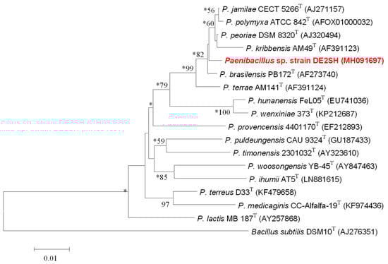 Identification of phylogenetic neighbors and calculation of pairwise 16S rRNA gene sequence similarities were achieved using the EzTaxon-e server []. Phylogenetic analysis was performed with the software package MEGA v.7.0 [] after multiple sequence alignments with CLUSTAL W []. Distances were calculated according to the methods of Jukes-Cantor []. Phylogenetic trees were inferred using the neighbour-joining [], maximum-parsimony [], and maximum-likelihood [] methods. The resultant tree topologies were evaluated by bootstrap analyses [] based on 1000 re-samplings of the datasets. The comparative analysis of the 16S rRNA gene sequence of strain DE2SH revealed that it was phylogenetically affiliated to the genus Paenibacillus (Figure 2). Paenibacillus sp. strain DE2SH had the highest 16S rRNA gene sequence similarities with the type strains P. jamilae (99.11%), P. polymyxa (98.85%), P. peoriaea (98.84%), and P. brasilensis (98.70%), and other species of the genus Paenibacillus (<98.10%).