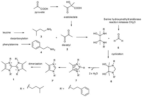 Detailed inspection of the structure of paenidigyamycin A (1) led to the speculation that 1 could be biosynthesized through the condensation of four units: diacetyl (2), 3-methylbutanamine (3), 2-phenyl-ethanamine (4), and formaldehyde (5). Diacetyl (2) is most likely derived from acetolactate through non-enzymatic oxidative decarboxylation. The precursors 3 and 4 are also the decarboxylation products of the corresponding amino acids leucine and phenylalanine, respectively. The cyclization intermediate 6 will then undergo dehydration to yield 7, followed by tautomerization to yield 7′. Finally, the dimerization occurs to provide 1, probably through a radical reaction between the two monomers (Scheme 1).