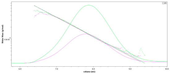 The molecular weight of the sulfated fucan was determined by size-exclusion chromatography (SEC) in the form of HPLC equipped with online multiangle static light scattering (MALS). The measurements were performed at ambient temperature using a Shodex LB-806 and a 2500 PWXL column as a separator. The measurement was executed with a Dawn HELEOS-8+ multiangle laser light scattering photometer (Wyatt, Santa Barbara, CA, USA) (λ0 = 660 nm) and a subsequent Optilab T-rEX differential refractometer. The mobile phase was 0.10 mol/L Na2HPO4 (pH = 7), and the flow rate was 0.2 mL/min. The injection volumes were 50 µL and 100 μL, with 1 g/mL. The data were obtained and processed using Astra (v. 7) software (Wyatt, Santa Barbara, CA, USA).
