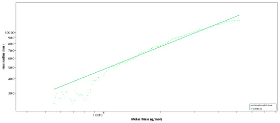 Rms conformation plot of the high-molecular-weight sulfated fucan (Fuc1) giving the rms radius [nm] versus M [g/mol], 100 µL injection. The slope (b) = 0.66 indicates a random coil.