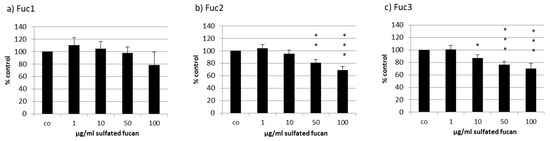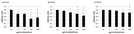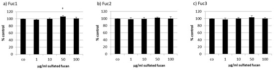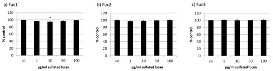 Cell viability was tested in RPE cells after treatment with LH sulfated fucans Fuc1 (a), Fuc2 (b), and Fuc3 (c) for 24 h. Cell viability was determined via MTT (3-(4,5-dimethylthiazol-2-yl)-2,5-diphenyltetrazolium bromide) assay and is shown as the mean and standard deviation in relation to an untreated control (100%). Significance was evaluated with ANOVA compared to the control (n = 3); * p < 0.05.