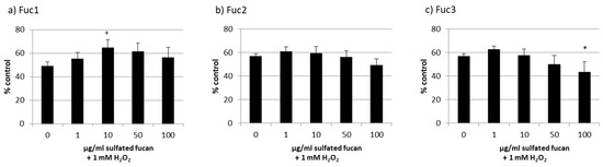 OMM-1 cell viability after treatment with Fuc1 (a), Fuc2 (b), and Fuc3 (c) and stress insult after 30 min incubation with the sulfated fucans. The oxidative agent was 1 mM H2O2, which reduced cell viability to under 60% in all cases. Viability was tested via MTS assay and is shown as the mean and standard deviation in relation to an untreated control (100%). The 10 µg/mL Fuc1 showed significant protective effects for the cell line. Significance was evaluated via ANOVA; */+ p < 0.05, versus 0 µg/mL sulfated fucan + 1 mM H2O2 (n = 4).