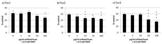 Cell viability was effectively lowered to nearly 30% through oxidative stress with TBHP, but all LH sulfated fucans lowered the viability additionally to a lesser extent (Figure 7); the strongest effect was from 100 µg/mL of the Fuc3 sulfated fucan, which lowered the viability even further down to 18% ± 1% (p < 0.05).